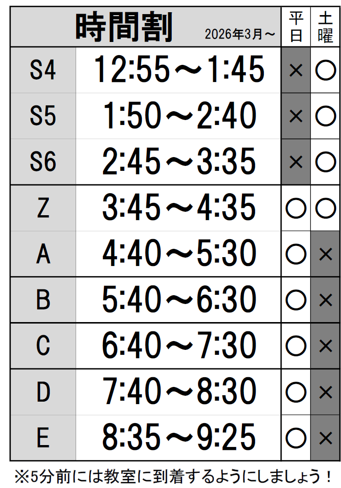 2026より時間割を変更いたします。